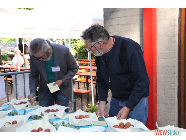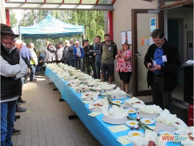Le jugement des œufs Cette année, il y avait 34 boîtes de six œufs de Marans inscrites; les participants venaient de Belgique, d'Allemagne, de France et des Pays-Bas. Parmi ces 34 boîtes, une série d'œufs des marans naines: pour des naines une très agréable couleur d'œuf.